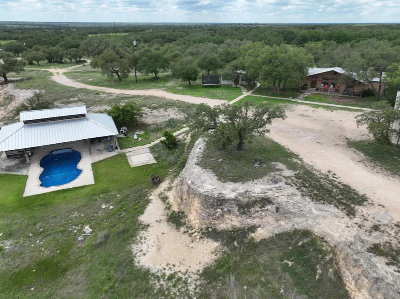 Swimming pool with covered porch area for hanging out and enjoying the hill country climate and temperatures