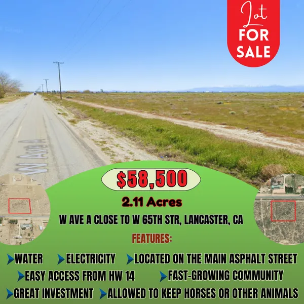 This 2.11-acre lot in Lancaster, CA, offers a unique opportunity to invest in a rapidly growing community. Located on W Ave A, close to W 65th St, the lot boasts easy access from HW 14, making it both convenient and highly accessible. Whether you're looking to build a dream home, start a small farm, or secure a valuable investment, this property has much to offer.