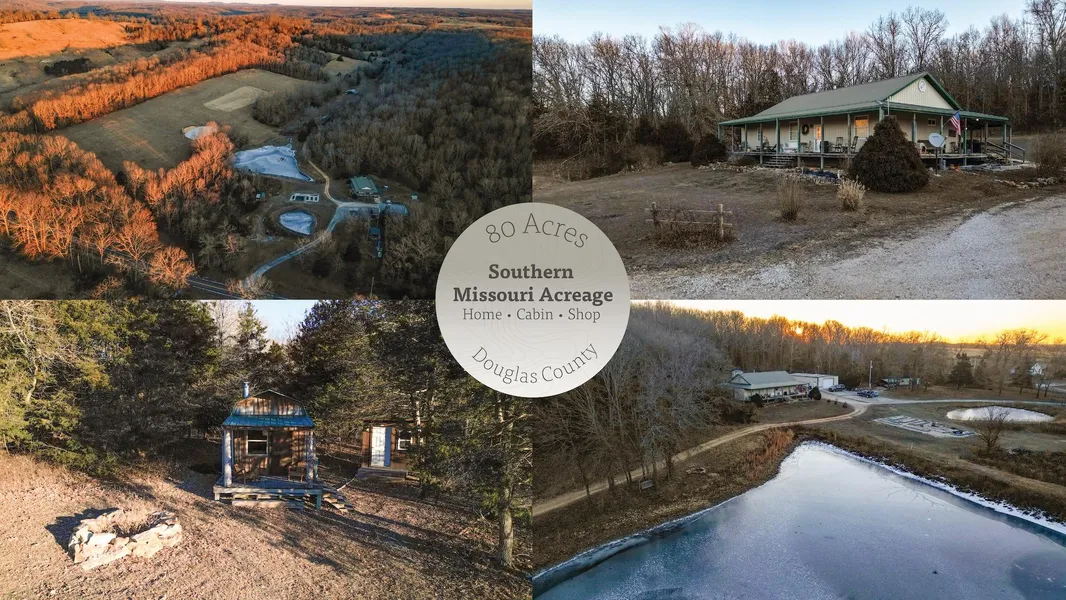 Southern Missouri Ozarks Acreage For Sale with Home, Cabin, and Shop with Living Quarters - Your Dream Retreat Awaits! Welcome to this exceptional 80 acre property, a rare find offering the perfect blend of privacy, comfort, and natural beauty. Located in Douglas County, the property sits 14 miles southeast of Norwood, MO and 18 miles southwest of Mountain Grove, MO. This expansive parcel of land is a true oasis, providing endless possibilities for outdoor enthusiasts, hobby farmers, or anyone seeking a peaceful escape. The well-maintained 1,440 sq ft home boasts an open floor plan with 2 bedrooms and 2 bathrooms. A cozy living room with a wood stove creates the ideal space to unwind after a day spent exploring the land. As you step outside, the expansive wrap-around porch offers a great place to enjoy your morning coffee, host evening gatherings, or simply enjoy a view of both ponds. The 30x50 shop provides generous storage space and functional workspace for hobbies, farm equipment, or any projects you can imagine. The shop also includes 600 sq ft of living quarters with 1 bedroom and 1 bathroom and washer and dryer available. A cozy cabin tucked back into the property offers a rustic retreat or a perfect guest house. Whether you're looking for a quiet place to read, an additional guest space, or cozy escape, this cabin will meet all your needs. Additional property features include: 3 wells, raised garden beds, a storm shelter, a cellar, and a sizable barn. This property is equipped with three private wells, one of which services a waterer for livestock. Enjoy the benefits of fresh, home grown produce with raised garden beds. The storm shelter is located just outside the home. The additional cellar is currently being used as storage for canned goods, preserving your food supply for the long term. A spacious barn offers room for livestock or hay storage, whether you're looking to raise animals or simply need space for tools and equipment.