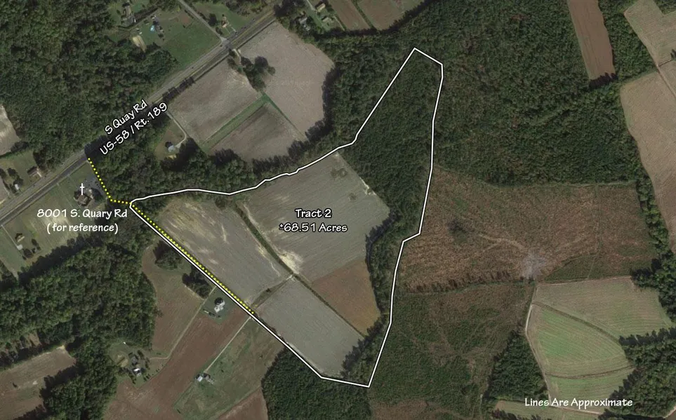 TRACT 2: +/-68 acres being Suffolk tax parcel 50*78. Approximately 45 acres of productive farmland with the balance in a mix of woodland. Long frontage on private road accessed from US-58 next to Laurel Hill Church (8001 S Quay Rd, Suffolk).