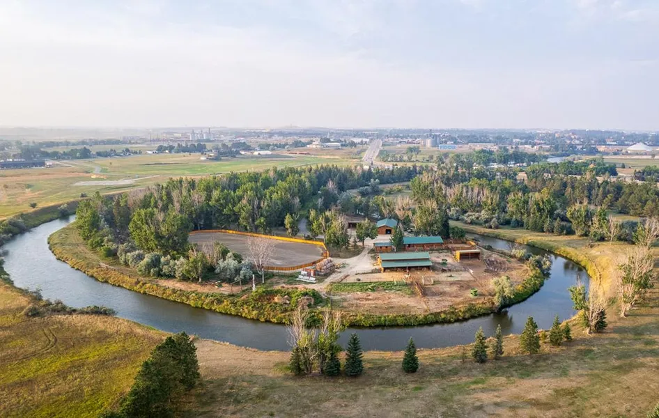 Located on the edge of Dickinson, North Dakota, Rosas Cantina Ranch has been the base of operations for a select horse breeding program for many years. Encompassing approximately 60 acres loaded with mature cottonwood, fir, and ash trees, its privacy and solitude are unparalleled for such a large property on the edge of a busy community. The Heart River meanders along and through the ranch for over a mile. The ranch features a 4,300 sq. ft. six bedroom, three-and-a-half-bathroom home with an attached two-car garage. Other improvements on the Rosas Cantina Ranch include a 150 x 300 outdoor arena with barn and stall area, 36 x 60 stall barn with runs and automatic waterers, 11 pipe corrals, 50 round pen, and a 60 hot walker. A log cabin bunkhouse is in front of the stall barn with a kitchen and bathroom. Plus, there is an enclosed 40 x 60 hay barn, and a large shop with concrete floors and a work room. Equipment is included in the sale of the property. An equipment list will be made available to interested parties.
