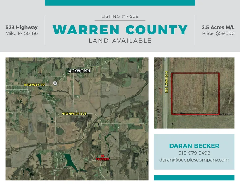 Offering 2.5 acres m/l on Highway S23 just Southeast of Indianola, IA in Warren County. This property comes with beautiful views of the rolling southern Iowa countryside, making it a perfect spot to build. The land will be surveyed with accepted purchase agreement and approved financing. If your looking for a larger tract there is additional land available up to 160 acres and including several ponds. This one will go quick so don't hesitate!