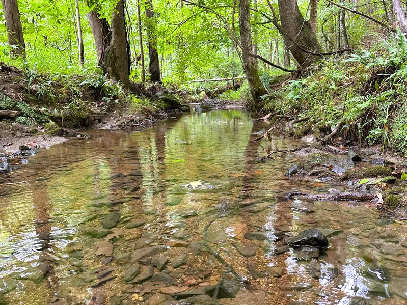 Diversity is abundant across the landscape. Upstream waters are clear, cool and rocky. Downstream, creek bottoms are wide, flat, and filled with hardwoods and grassy glades. Uplands are rolling hills covered by a mix of old and young planted pines. Steeper slopes overlook the creek bottom in places.