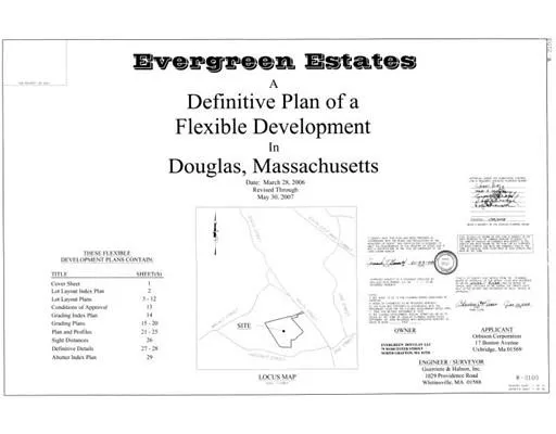 Welcome to Evergreen Estates. The site is located at South Street in Douglas, MA. It is approximately 50 minutes to Boston. A short 30 min drive to Providence Rhode Island, and less than 30 min to Connecticut. The Evergreen subdivision is 67 acres with potential for 27 lots, and 31 houses. The road construction in completed as well as electric in place. All manholes, catch basins and curbing are also finished.