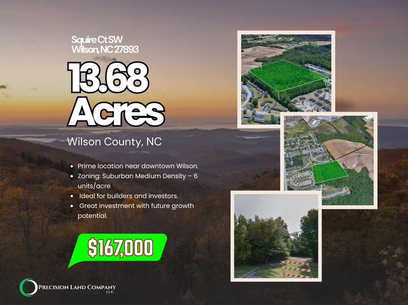 Unlock the potential of this 13.68-acre property in Downing Village Phase 2, perfectly situated near Wiggins Mill Reservoir. Just 2.5 miles from downtown Wilson, this land offers the best of both worldspeaceful rural living with quick access to city conveniences. Whether youre looking to build multiple homesites or create a private retreat, this property is an ideal canvas for your vision. Zoned Suburban Medium Density (6 units per acre), the property offers the potential to develop up to 39 new homesa rare opportunity in a fast-growing area just 2.5 miles from Downtown Wilson.