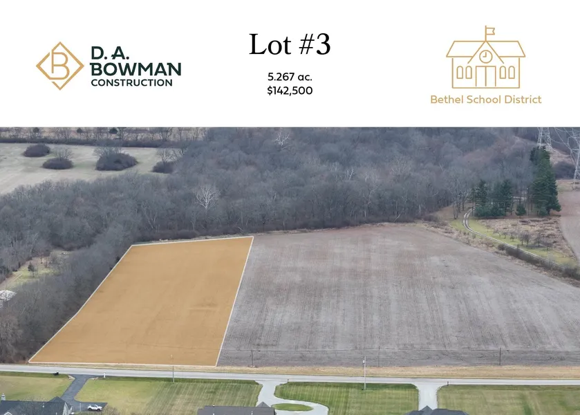 Nestled in the heart of Miami County, OH, Charleston West emerges as a serene country development that redefines rural living with a touch of elegance and boundless natural beauty. This coveted Lot #3, situated within the prestigious Bethel School District, offers an unrivaled opportunity for those seeking a harmonious blend of countryside tranquility and convenient access to urban amenities. Designed by the acclaimed DA Bowman Construction, known for their commitment to quality and bespoke design, Charleston West presents magnificent homes set on expansive rural lots of over 5 acres. Each home is a testament to luxurious living, surrounded by lush trees that offer privacy and a sense of seclusion. The community is enveloped in natural beauty, with more than 15 parks or walking trails within a 17-mile radius, including some of Ohios most beautiful metro parks, inviting residents to connect with nature and indulge in outdoor activities. Lots are exclusive to builder DA Bowman Construction. They specialize in crafting exceptional custom homes, designed exclusively to reflect your unique vision. Their commitment to excellence is unrivaled, ensuring each detail is tailored to your preferences. Quality craftsmanship is their hallmark, using only the finest materials and skilled artisans for superior durability. With end-to-end support, they guide you through the entire process, making it seamless and stress-free. Transparent budgets, local expertise, and a customer-centric approach define their service. Explore our award-winning portfolio, showcasing their passion for unique design and attention to detail. Your dream home is just a consultation away. Let D.A. Bowman Construction build the home of your dreams! Discover the blend of rural charm and modern luxury with Charleston West, and embrace the lifestyle youve always desired. For more information and to schedule a visit, contact us today. Your dream home starts here.