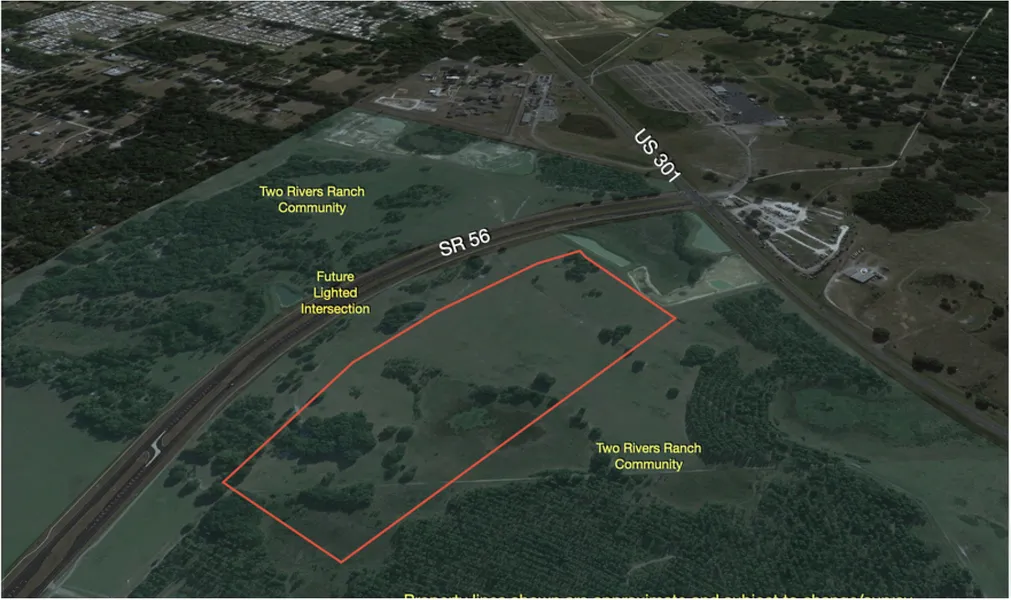 PROPERTY DESCRIPTION - The opportunity is to acquire up to 30 acres planned for 3-story apartments totaling 570 units along the south side of SR 56 within the heart ofthe Two Rivers Ranch 3,400 acre master-planned community in Wesley Chapel, FL. The entire site is within a qualified opportunity zone. Theseller is in process of mitigating the wetlands and expects all wetland impacts by mid 2022. Water and sewer will be delivered to the site withadequate capacity. The site is not within any CDD or HOA and therefore is stand alone without access to any of the Two Rivers Ranch planned community amenities. Due to the highly prominent location, the Seller will require architectural control of the elevations to be developed in a first-class manor with a requirement for mature landscaping to be part of the project. The site is being offered with a metes and bounds legaldescription and WRA is the engineer of record. Seller has all due diligence available for review upon request. Horizon Wiregrass is the mostrecently completed apartment project in this sub-market and is getting $2.31 rents. Seller would consider subdividing theparcel parcel into 2 sales, but will not offer any option or ROFR on the second parcel. There is no co-broke offered on this listing. Buyer must paytheir broker.