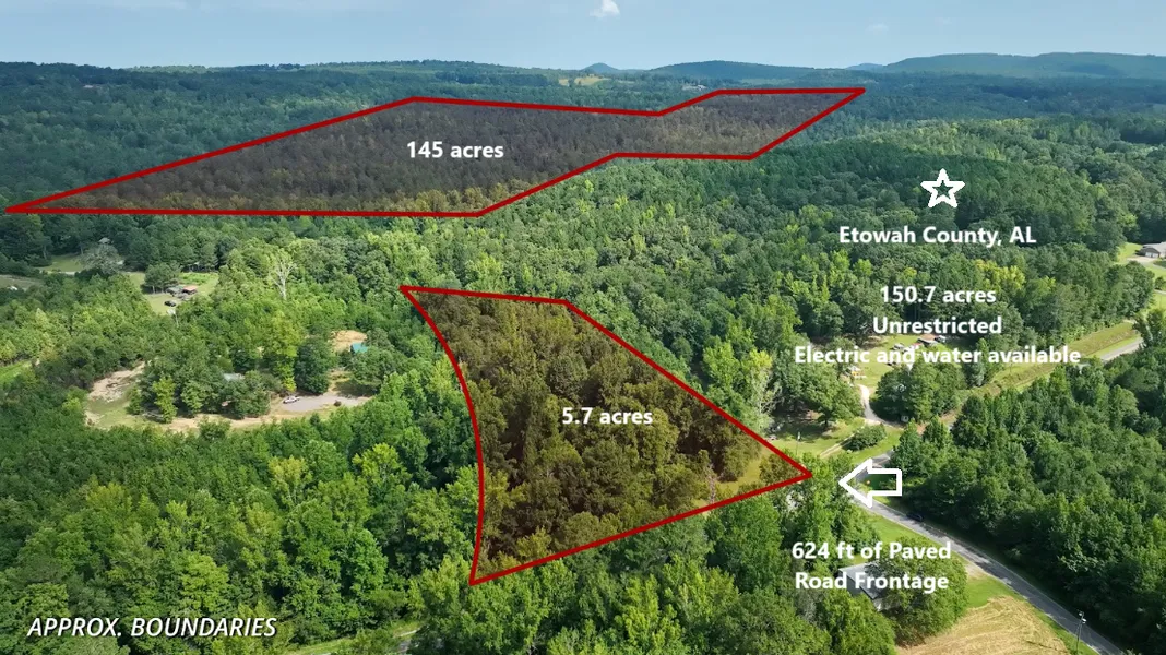 This 150.7-acre unrestricted property in Etowah County, AL, offers a prime opportunity for hunting, recreation, and development. With its natural beauty, versatility, and accessibility, it's perfect for those seeking to escape city life and enjoy the outdoors. The land features a slight slope and wooded terrain, providing an ideal setting for hiking, hunting, or simply relaxing in nature. A well-maintained trail crosses half of the property, allowing for easy exploration of the expansive landscape. With electric and water services available, this property is well-positioned for future residential or recreational development.