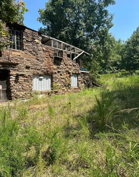 The charming rock house could be renovated into a barn, workshop, or storage space. A mix of mature hardwood trees offers beauty and shade, while partial fencing adds practicality. A small pond is located on-site, currently holding minimal water but with potential for improvement.