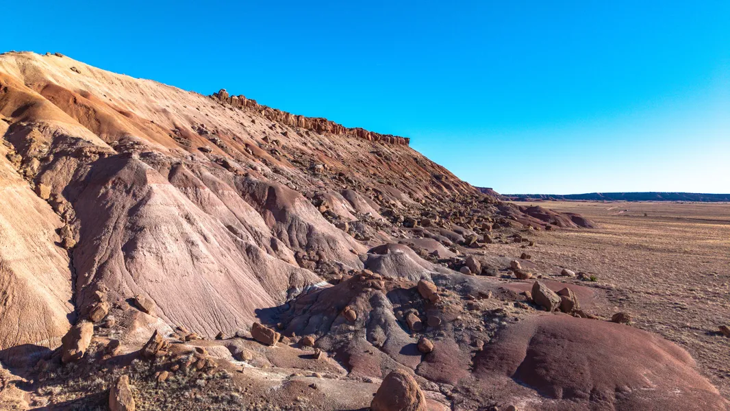 Your own gateway to Arizona's painted desert country awaits on this 43.5-acre property in Bonito Valley Ranch. A dramatic 200-foot painted rock formationa natural mesa of layered sedimentary rock in striking desert huesrises directly from your eastern boundary, creating a backdrop that transforms throughout the day as sunlight plays across its surface. Large boulders scattered at the base sit on your land, and your property extends halfway up the formation itself.