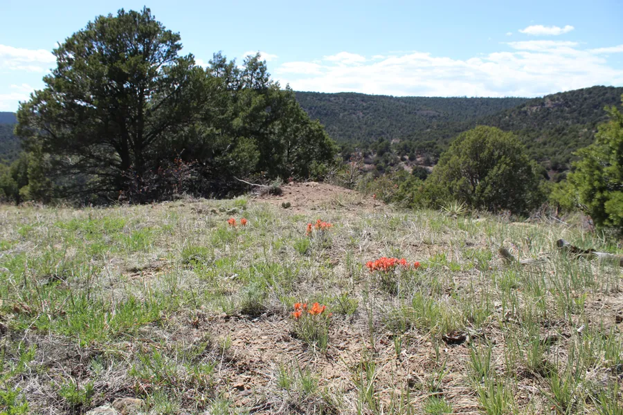 Pines, Juniper, and Gambel Oak. There is a small meadow with two water tanks located at the edge of this meadow that