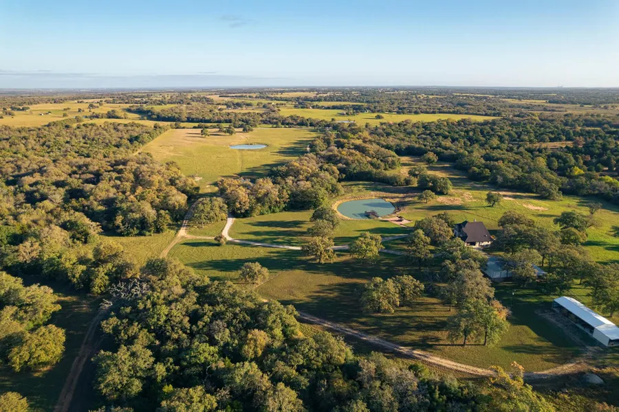 The Liberty Bell Ranch offers ultimate seclusion and privacy with proximity to the conveniences of the city. As you enter the ranch off a paved and recently resurfaced County Road 479 through the custom designed automatic gate, there is an all-weather crushed concrete road. It winds through the scenic oak studded pastures and ponds toward the back of the property where you will find a stunning two-story custom stone home. The area around the home is very secluded and surrounded by wooded areas, a pond with dock, pergola, and is fenced from the rest of the ranch. The fencing allows the livestock to graze the ranch while maintaining a manicured lawn around the improvements. The home site is also fully outfitted with an enclosed equipment storage barn/shop, open shed, and covered dog run/kennel. The scenic terrain is gently rolling with improved pastureland surrounded by heavily wooded areas. There are 2 wet weather creeks that traverse the property along with four tanks providing an excellent habitat for wildlife, as well as an excellent turnkey livestock grazing operation.
