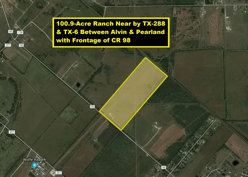 Great Deal! Nice 100.908-Acre Ranch near Manvel High School, TX-6, TX-288 & Proposed TX-99 with American Canal Frontage & ~1320 ft CR 98 Road Frontage. Property is located East of TX-288 & North of TX-35 only 8 miles to Alvin, Pearland, & proposed Grand Parkway/TX-99. Houston's Longest Loop (The Grand Parkway/TX-99) will span 180+ miles from League City-Rosharon-Katy-Tomball-Baytown (See Map) when completed! Great location just 15 miles to Hobby Airport & 26 miles to Downtown Houston & TX Medical Center. Perfect for grazing and/or hay production/farming. Property is within Manvel City Limits and has gate onto CR 98. No survey. SELLERS will CONSIDER Selling the acreage that does not include Pipeline Easements ROW at a slightly lower Sales Price. SELLERS would retain ROW acreage, but will agree on crossover Easements and designated access to all parts of the 100 acres. SELLERS will Lease Grassland Easements to BUYER as first option. Pipeline Easements will be marked and easily identifiable. Details to be agreed upon at Closing.