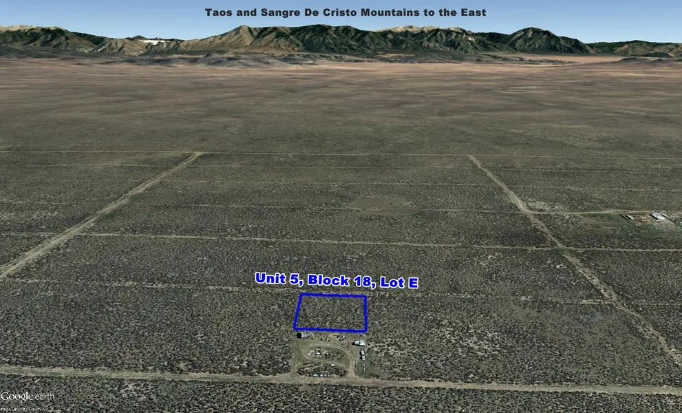 This 0.5 acre property sits in the northern part of Unit 5. It has 127 feet of platted road frontage on its east side and is 172 feet deep. The Tres Piedras Arroyo is a small stream that runs through the area and it is only about 0.47 mile to the west of this property