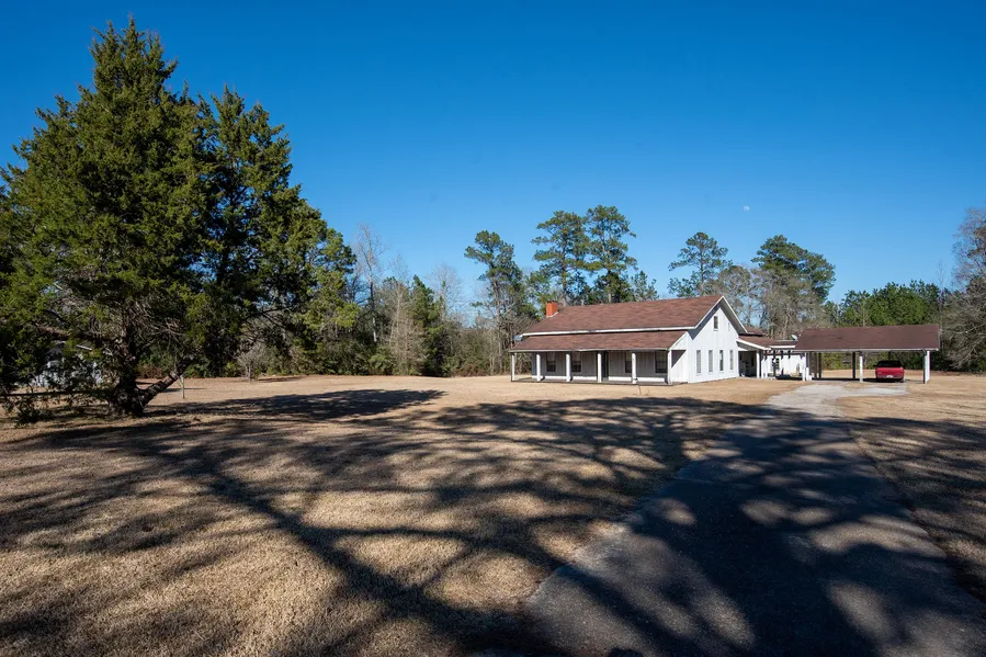 Out front of the main home is a neat covered wood-decked sitting porch, a two-car carport is attached along with a detached one car garage or storage room. Built along the road frontage the frame on slab guest home has 720 square feet, kitchen/living room combo, with two-car detached carport. The property is mostly level and has large shady trees, beautiful grassy lawn with some woods in the rear. Several barns and storage buildings complete the improvements.