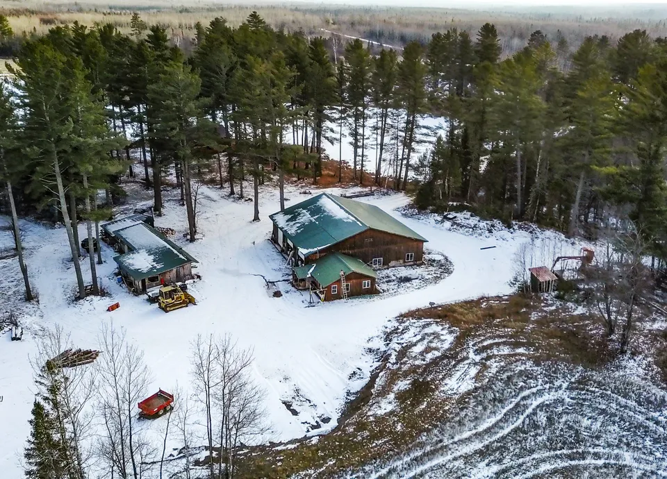 For sale: Expansive Northwoods estate spanning 1,277 acres with multiple cabins and outbuildings. Known as "Fox Farm" or "The Moose Pond," this secluded retreat is located at mile marker 23, north of Amasa. At its heart is a custom 3,000 sq ft log lodge, surrounded by water on three sides and designed for off-grid living. The lodge features 4 bedrooms, 3 bathrooms, a full basement with a large sauna, gas hot water, a fireplace, outdoor central boiler, and a new solar-powered generator system housed in a separate building with two large solar panels.