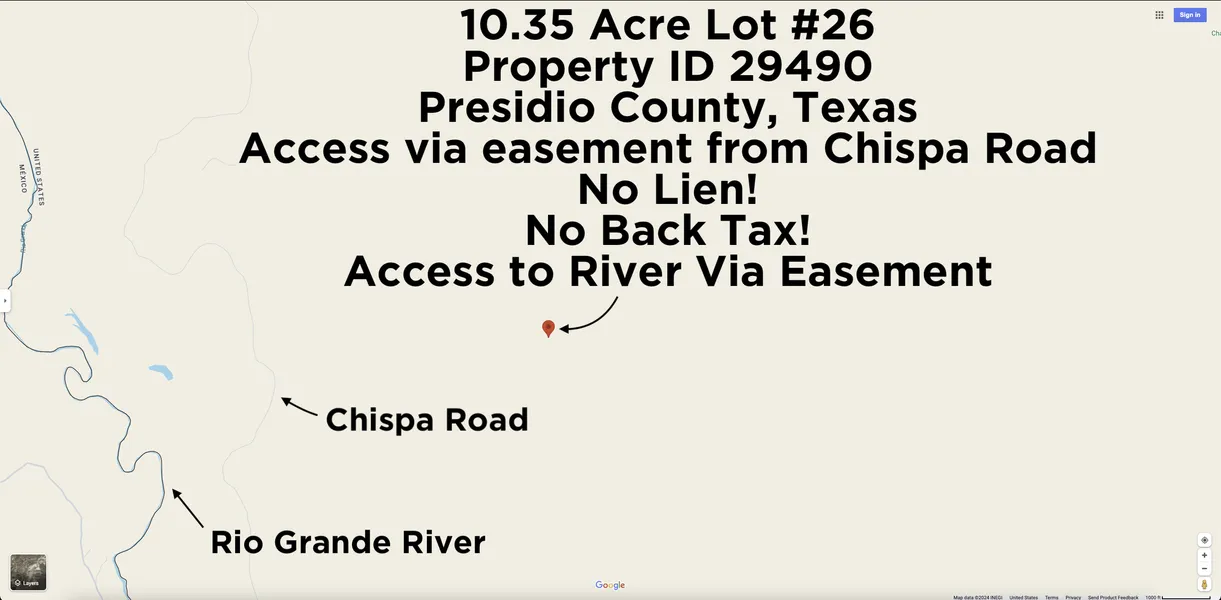 Legal Description: LOT 26, A 10.35 ACRE TRACT OUT OF THE NORTH HALF OF SECTION 65, BLOCK 2, T&P RR COMPANY SURVEY, PRESIDIO COUNTY, TEXAS.