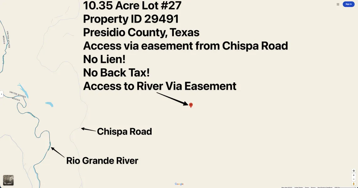 Legal Description: LOT 27, A 10.35 ACRE TRACT OUT OF THE NORTH HALF OF SECTION 65, BLOCK 2, T&P RR COMPANY SURVEY, PRESIDIO COUNTY, TEXAS.