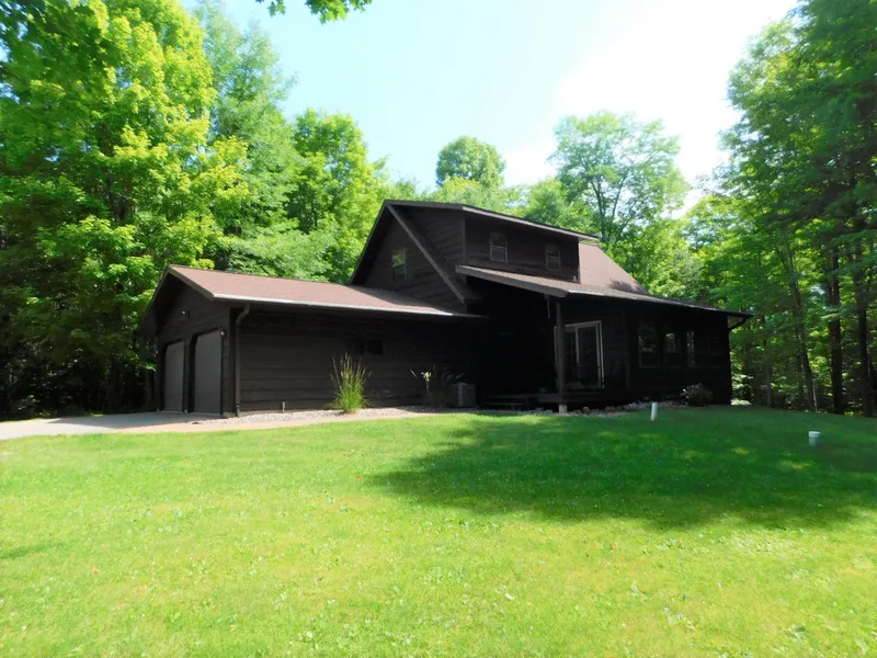 Oh what a setting! Hidden in the woods, set in off the road on a 20 acre wooded parcel, is this 3 bedroom, chalet style home. Incredible sunroom type formal dining, wood burning fireplace in living room, and loft master suite. Just what you would expect in a home in this setting. The kitchen has custom country type cabinetry, and there is a main floor laundry. Garage is attached, and has a perfect front porch to enjoy nature at its finest. Basement is mostly finished, with walkout to back yard. Storage shed for extra toys.