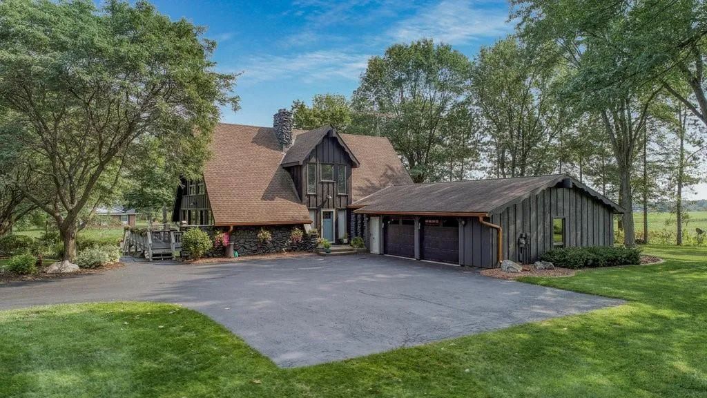 This one of a kind, 4 bedroom, 3 bath chalet style home sits on 2.05 beautiful acres on the edge of town. The main floor vaulted ceiling, floor to ceiling windows, wood floors and massive stone fireplace with pellet insert greet you at the door. The kitchen features double wall ovens, large inset range, breakfast nook with views out onto the back yard. Main floor master bedroom suite with large custom walk-in closet. Two upper bedroom with full bath and loft family room area. Newly remodeled, finished basement with full bar area and wood burning fireplace. Sliding glass doors take you out onto the large, private patio with firepit and place for the hot tub. From the copper gutters to the wood grain tile flooring in the master bath, this home has had every custom touch you could imagine. Attached heated & insulated 29 x 29 garage with brand new doors and openers, all new landscaping, wrap around deck to a 3 season screened in area off the kitchen. This home is a must see!