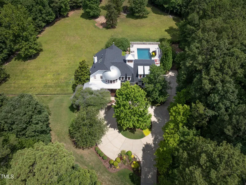 An Artist's Dream Home. This 5 Bedroom and 4.5 Bath Custom Home is full of Character and Creative flair. Nothing boring here! This home was designed with a vibe for the imaginative person who loves Free Flowing Rooms with whimsical touches. A uniquely different home surrounded by stunning landscapes. It's filled with natural wood carvings, art, and creative wrought iron accents. The home sits on 5.5 acres with stunning views of trees, open spaces, a swimming pool, a huge yard, and backs onto Falls Lake. It features an open kitchen with a bar and a sitting room with a fireplace, a craft room, an office area, and a pantry/mudroom. The second floor has a master suite, oversized bedrooms, private baths, and plenty of room to expand. The lower level includes a family room, guest bedroom, and ample storage. Enjoy a quiet walk around the grounds or to the lake. Relax on the large covered front porch or by the pool. It also offers easy access to shopping, RTP, and I-540. 360 Tour: