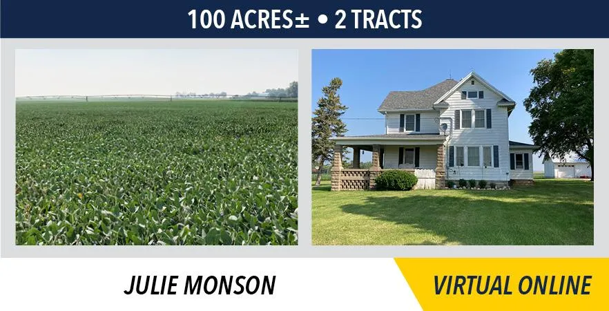 Tract 1 of the Monson farm will be sold on a price per acre basis, based on surveyed acres. Tract 2 will be sold for a lump sum total dollar amount. The tracts will NOT be offered in their entirety at the conclusion of the auction.