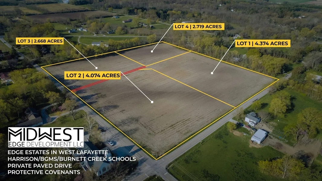 Protective covenant building lots for new homes and custom homes in the Burnett Creek / BGMS / Harrison School district. Minutes from all the amenities of West Lafayette & Purdue University